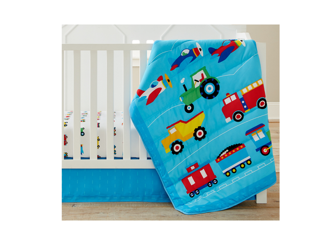 Made from extra soft microfiber fabrics, this 3 piece set includes a printed comforter, fitted bottom sheet and coordinating bedskirt. Fits a standard size crib mattress 28 x 52 .