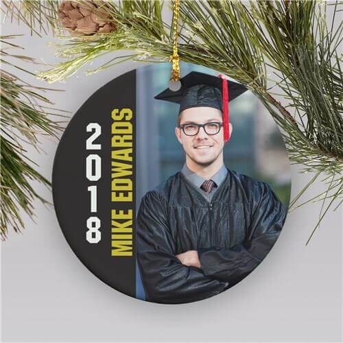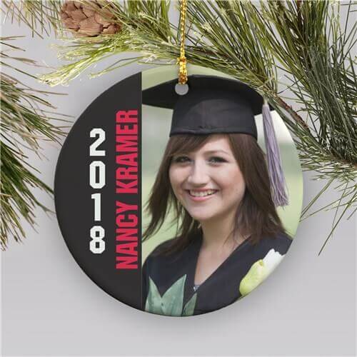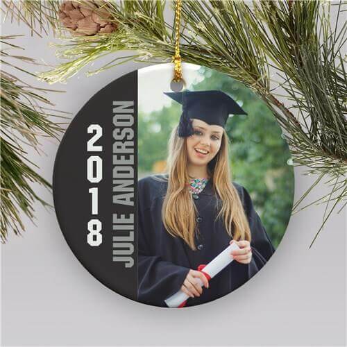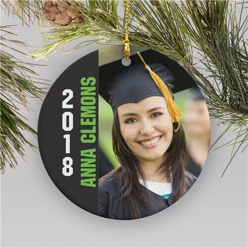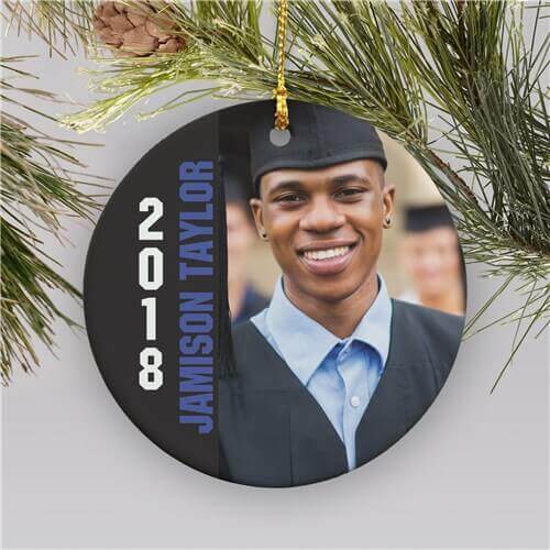 This Personalized Graduation Photo Ornament creates an everlasting keepsake that commemorates your graduation. Personalize this Graduation gift with Any name, graduate year and photo of your choice. With this Graduation Ornament you can have it forever displayed in your home for all to acknowledge your graduates accomplishments. Round Disk Ornament is flat and measures 3" in diameter. Each Ornament includes a ribbon loop to easily hang from your Christmas tree. Imported.