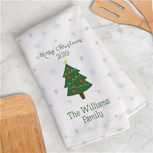 Give your kitchen a festive and cozy touch this Christmas with this Personalized Family Name Christmas Tree Dish Towel.