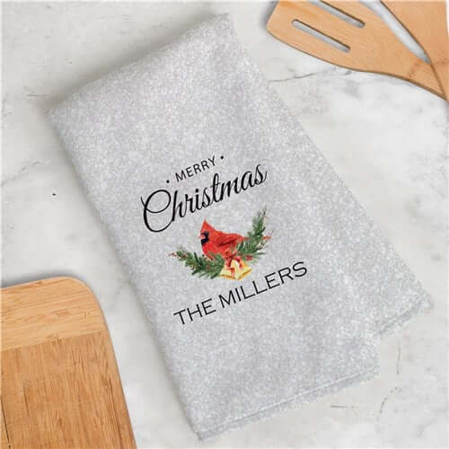 Give your kitchen a festive and cozy touch this Christmas with this Personalized Merry Christmas Cardinal Dish Towel.