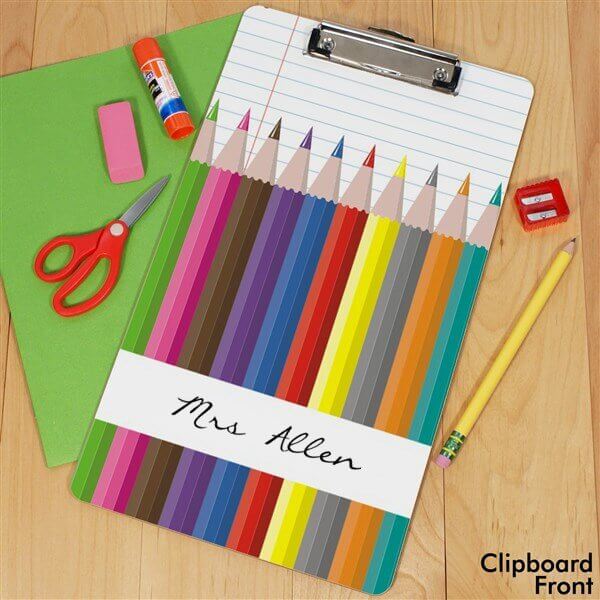 Allow your teacher to show off their class with this personalized "colored pencils dry erase" personalized teacher clipboard. Each clipboard can be personalized using any name. Clipboard is a high gloss .25" thick tempered hardboard clipboard. Choose between letter or legal size. Each clipboard is sold with a dry erase marker.