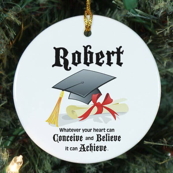 Personalized graduation Christmas gifts to show off your graduate during the happiest time of the year! Round Disk Ornament is flat and measures 3" in diameter. Each Ornament includes a ribbon loop to easily hang from your Christmas tree. Imported.