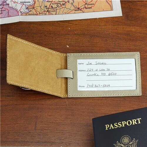 Your adventure officially beings! This Personalized Leather Luggage Tag is perfect for all the new grads.  Begin your adventure with this Leather Luggage Tag, personalized specially with any custom message line and Any year.  This Personalized Tag will help your luggage stand apart from others. Tan leather, measures 4.5" x 2.75". Features a buckle strap and clear window for personal info.