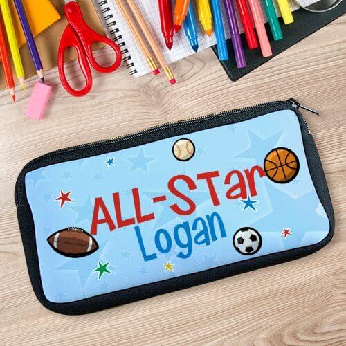 Go back to school in style with this cool Personalized All-Star Pencil Case. This Pencil Case is perfect for keeping all your school essentials organized throughout the day. Make it a one of a kind gift for your huge sports fan on his first day of school. Your All-Star Personalized Pencil Case is Black Neoprene and measures 8" x 3.875". Includes FREE Personalization. Personalize your Pencil Case with any name. (ie. Logan)