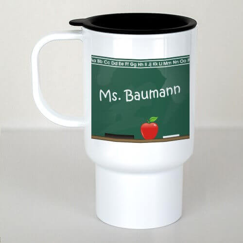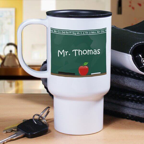 Show your favorite teacher how much they mean to you with Customizable Travel Mugs. All Personalized Mugs are dishwasher safe & include FREE Personalization! Personalize your Teacher Travel Mug with any teacher's name. Personalized teacher gifts make excellent teacher appreciation gifts or birthday gifts for teachers. Let the world's best teacher know how much you appreciate them with this personalized travel mug. Our custom polyester mug features a teacher specific design and can hold up to 15 ounces. Personalize for free to make for a unique teacher appreciation gift. He or she will appreciate this thoughtful gift.