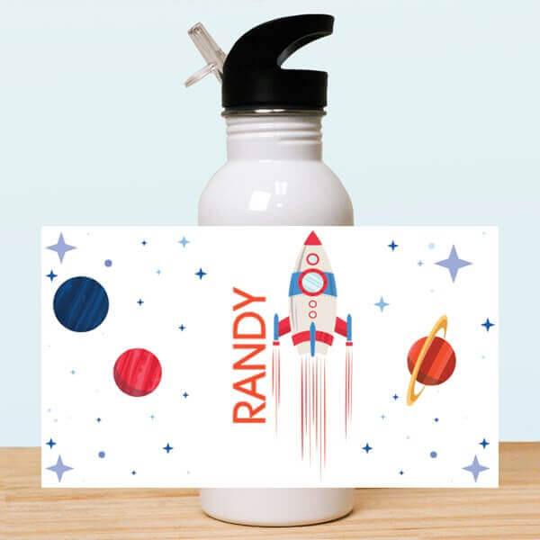 This Personalized Rocket Ship With Planets Water Bottle is the perfect accessory to keep your little boy going all day long.