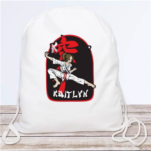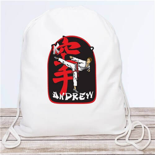 If your young boy or girl is a karate nut, then this is just the personalized gym bag you'll want to give them as a back to school gift! They'll love the fierce karate design coupled with the personalization. With this item, they'll be the envy of their karate class. Our Karate Sport Bag is a cotton/poly blend canvas reusable sports bag measuring 17.5" h x 13" w. Each Custom Sports Bag is made especially strong to hold your important essentials with a drawstring top closure. Free personalization of any name and gender is included.